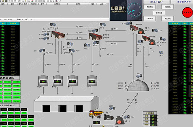 通過中控系統(tǒng)可以實現(xiàn)礦山設備的一鍵開關及單獨控制,通過傳感器等自動采集設備運行狀體及工作情況,如軸承溫度、設備工作電流、電壓、速度等狀態(tài)監(jiān)測,對電量、產(chǎn)量統(tǒng)計。實現(xiàn)各級設備及各環(huán)節(jié)的集中控制及管控。