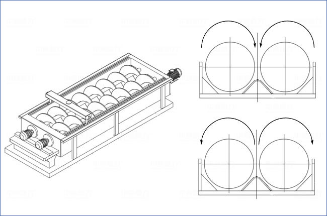 為了將砂匯集到洗砂槽中部的排出槽體,雙螺旋洗砂機(jī)兩個(gè)螺旋是呈相反方向進(jìn)行旋轉(zhuǎn),可以是相對(duì)旋轉(zhuǎn),也可以使相向旋轉(zhuǎn),如下圖所示。
