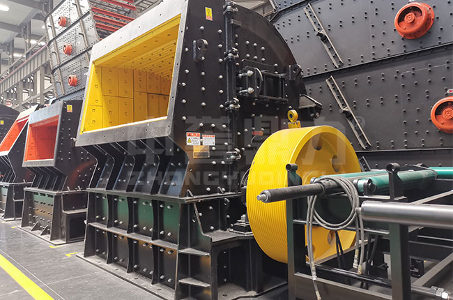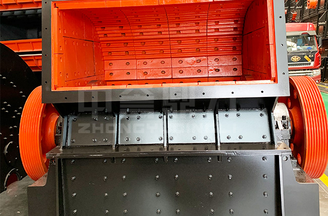 左側(cè)圖片就是反擊式粉碎機的結(jié)構(gòu)圖,該設(shè)備主要由機架、襯板、反擊襯板、反擊架、進料斗、電機、傳動裝置等組成,其中反擊板分為三組,形成兩個粉碎腔,在第一個粉碎腔可以把≤850mm的物料粉碎成100mm以下。在第二個粉碎腔中可以把100mm的物料在粉碎至20mm以下,平常需要兩臺設(shè)備來粉碎,這里只需要一臺反擊式粉碎機,過程簡化為一段破碎,另外設(shè)備整體結(jié)構(gòu)緊湊、外形美觀。