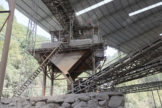 中轉(zhuǎn)料倉通過儲存粗碎后的原料可均衡骨料加工線整體的系統(tǒng)能力,粗破工段檢修時,下游的骨料加工工段不會因此停產(chǎn),可減少停工損失,中轉(zhuǎn)料倉頂部設(shè)置防雨棚,底部預(yù)留排水孔,可進入二級破碎階段原料的含水率,是采用干法加工時,能有限成品含粉量,減少石粉粘結(jié)堵塞篩網(wǎng)、溜槽、溜管。中轉(zhuǎn)料倉盡量借助地勢,提高儲量。