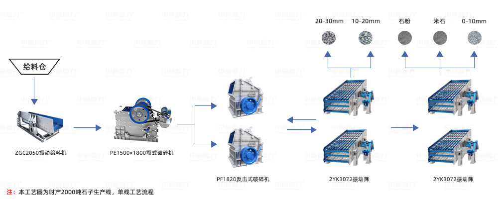 主要設(shè)備配置:DLZGC2050振動(dòng)給料機(jī)2臺(tái)+PE1500×1800顎式破碎機(jī)2臺(tái)+PF1820反擊破4臺(tái)+2YK3070振動(dòng)篩8臺(tái)