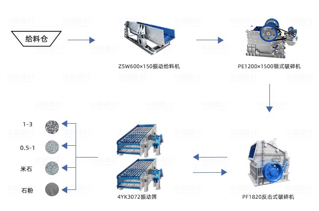 設(shè)備配置:ZSW600×150振動給料機(jī)+PE1200×1500顎式破碎機(jī)+PF1820反擊式破碎機(jī)+4YK3072振動篩2臺