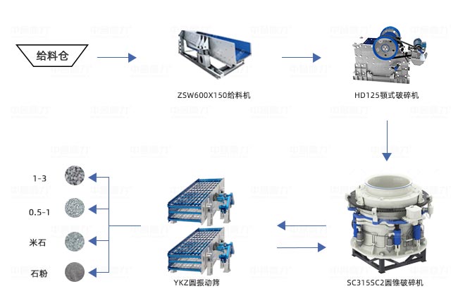 設(shè)備配置:ZSW600X150給料機(jī)+HD125顎式破碎機(jī)+SC315SC2圓錐破碎機(jī)+皮帶機(jī)