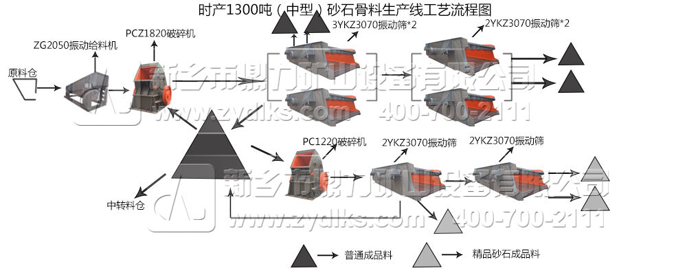 從流程工藝圖可以看到。物料從原料倉進(jìn)入振動(dòng)給料,勻速運(yùn)動(dòng)的物料被輸送至破碎機(jī)進(jìn)行破碎,一部分破碎物料經(jīng)過振動(dòng)篩篩分出符合粒度物料,成為普通的成品砂石料。另一部分破碎物料被輸送至中轉(zhuǎn)料倉,可用于進(jìn)行加工普通成品料的原材料,也可經(jīng)過整形式破碎機(jī)破碎,獲得品質(zhì)比較高的砂石骨料。