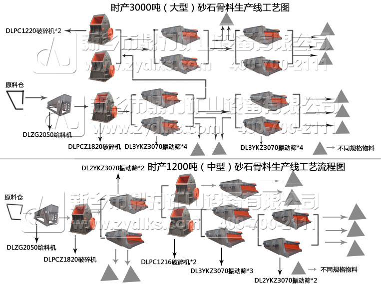 從上面流程圖和配置清單可以看出,不同產量的生產線可以通過不同產量設備的搭配使用來進行砂石生產線的配置。3000噸石料生產線與1200噸石料生產線使用相同型號的振動給料機,但是卻使用的是不同型號錘式破碎機,型號不同,產量也就不同。同時振動篩數(shù)量的增加也會提高生產線的產量。