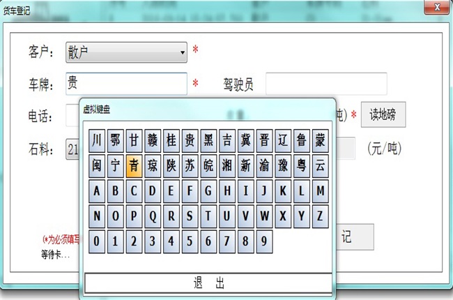如上圖,當(dāng)打開(kāi)貨車(chē)登記的界面打開(kāi)后,只需要在“車(chē)牌”的輸入框里點(diǎn)擊鼠標(biāo),就會(huì)彈出一個(gè)包含省份簡(jiǎn)稱(chēng)、字母和數(shù)字的虛擬鍵盤(pán),操作員只需要用鼠標(biāo)點(diǎn)擊需要的虛擬按鍵就可以了,免去了打字的煩惱,解決了用戶(hù)的電腦使用水平不高、打字慢的問(wèn)題。
