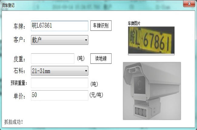 如上圖,操作員點(diǎn)開(kāi)“貨車(chē)登記”對(duì)話(huà)框后,車(chē)牌識(shí)別機(jī)自動(dòng)開(kāi)機(jī)抓拍識(shí)別,得到的圖片和車(chē)牌號(hào)都相應(yīng)的顯示在對(duì)話(huà)框中。更加提高了車(chē)牌輸入的速度,真正體現(xiàn)了軟件操作簡(jiǎn)便快捷的特點(diǎn)。