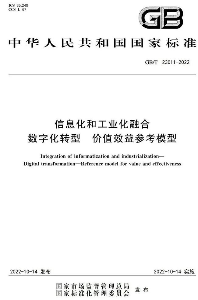 2022年10月,國家市場監(jiān)督管理總局(國家標(biāo)準(zhǔn)化管理委員會)發(fā)布2022年第13號中國國家標(biāo)準(zhǔn)公告,批準(zhǔn)《信息化和工業(yè)化融合 數(shù)字化轉(zhuǎn)型 價值效益參考模型》(GB/T 23011-2022)正式發(fā)布。