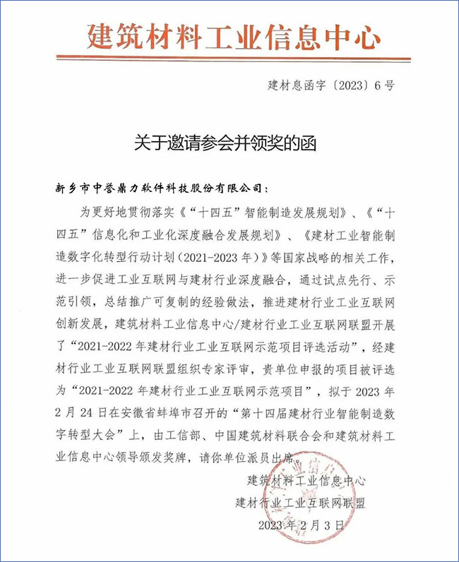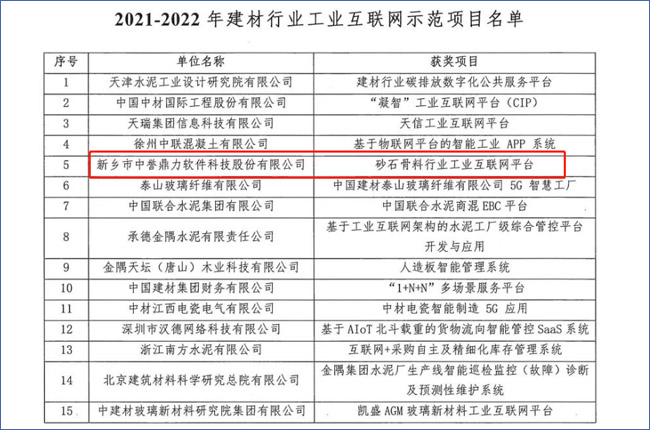 新鄉(xiāng)市中譽(yù)鼎力軟件科技股份有限公司“砂石骨料行業(yè)工業(yè)互聯(lián)網(wǎng)平臺”項(xiàng)目被評為“2021-2022年建材行業(yè)工業(yè)互聯(lián)網(wǎng)項(xiàng)目”。