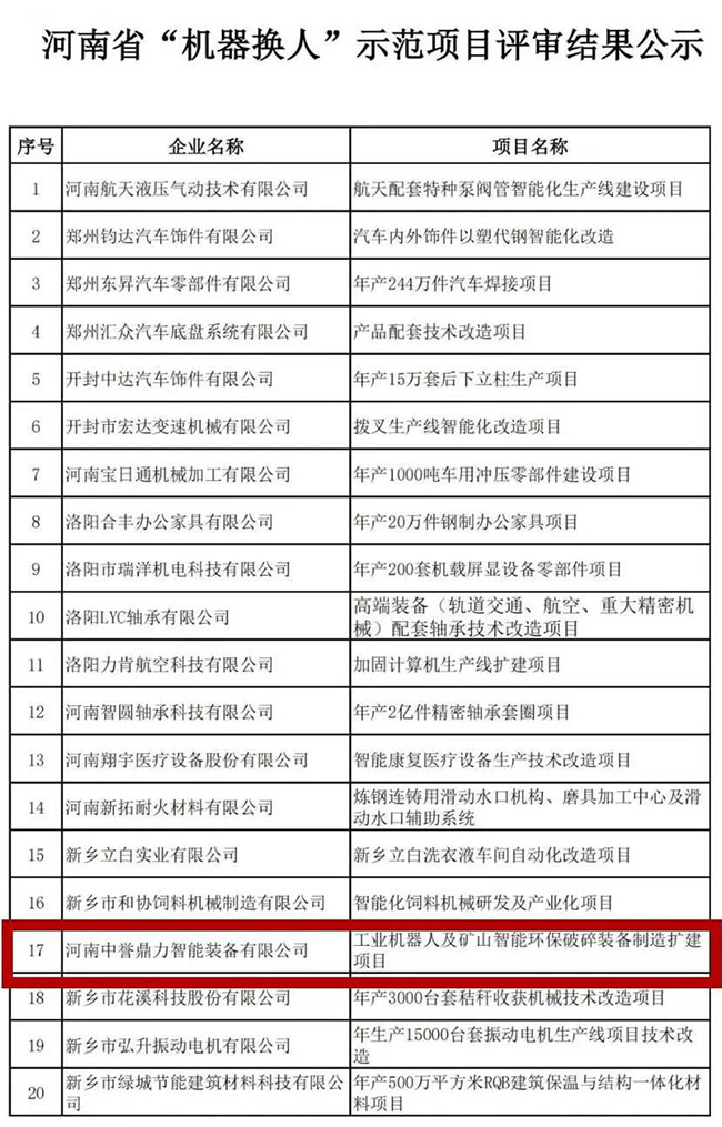 其中,河南中譽(yù)鼎力智能裝備有限公司工業(yè)機(jī)器人及礦山智能環(huán)保破碎裝備制造擴(kuò)建項(xiàng)目成功通過(guò)評(píng)審。