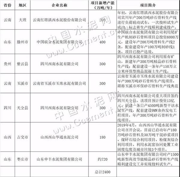 以下表格列舉了部分水泥企業(yè)2019年投產(chǎn)的砂石骨料生產(chǎn)線,年產(chǎn)骨料約2400萬(wàn)噸。