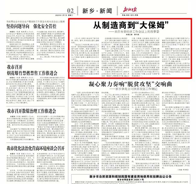 1月7日,《新鄉(xiāng)日?qǐng)?bào)》在二版頭題位置刊發(fā)了《從制造商到“大保姆”》一文,報(bào)道了中譽(yù)鼎力從單一的礦山設(shè)備制造商發(fā)展成涉及建材域上下游產(chǎn)業(yè)的“大保姆”的轉(zhuǎn)型歷程。