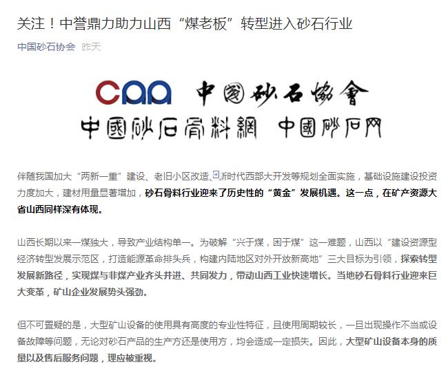 中砂石協(xié)會(huì)發(fā)表關(guān)于"中譽(yù)鼎力助力山西‘煤老板’轉(zhuǎn)型進(jìn)入砂石行業(yè)"的報(bào)道