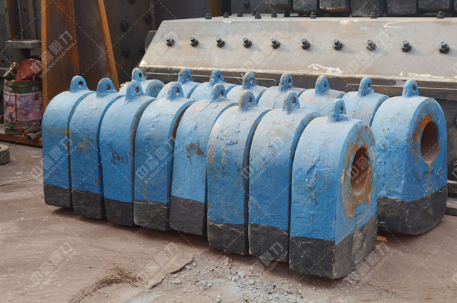 選擇錘頭材質(zhì)時(shí),要了解破碎的物料組成及其硬度、粒度、尖角銳度、水分等。物料硬度越高,對(duì)錘頭材質(zhì)的硬度要求越高;而物料塊度越大,對(duì)其韌性要求越高。