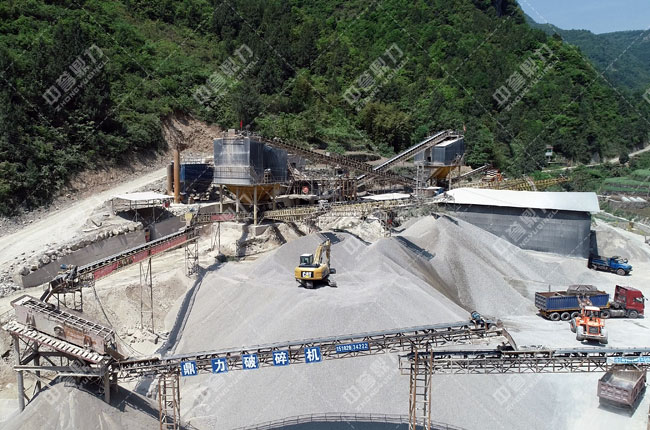不變式:鄂破機+重錘反擊式破碎機+石子篩+喂料機+傳送機+脈沖防塵/噴淋降塵體系