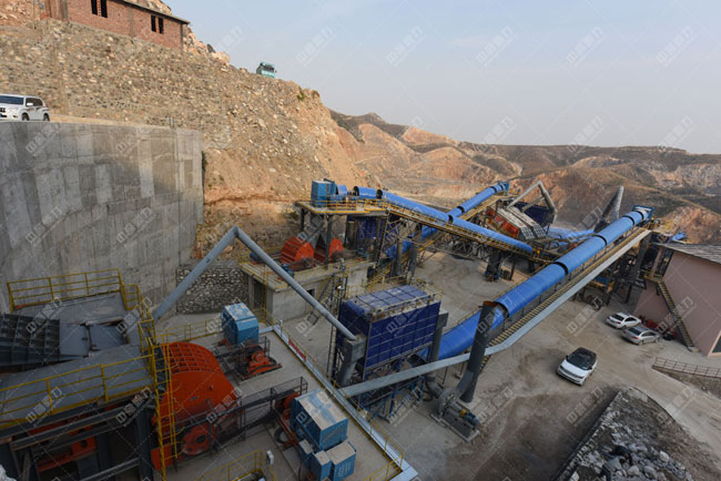 步驟:原料堆+ZSW490×110震動喂料機+HD98鄂破+HXHP圓錐式破碎機+4YK2460篩分機+傳送機100米