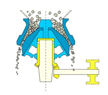 圓錐式破碎機(jī)(圓錐破碎機(jī))工作時(shí),電動(dòng)機(jī)的旋轉(zhuǎn)通過(guò)皮帶輪或聯(lián)軸器、傳動(dòng)軸和圓錐部在偏心套的迫動(dòng)下繞一固定作旋擺運(yùn)動(dòng),從而使圓錐破碎機(jī)的破碎壁時(shí)而靠近又時(shí)而離開(kāi)固裝在調(diào)整套上的軋白壁表面,使礦石在破碎腔內(nèi)不斷受到?jīng)_擊,擠壓和彎曲作用而實(shí)現(xiàn)礦石的破碎。