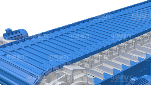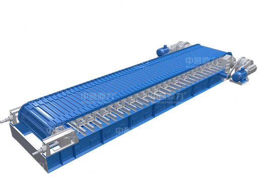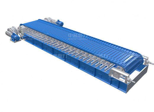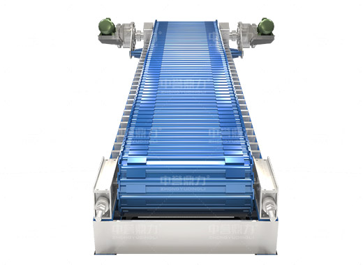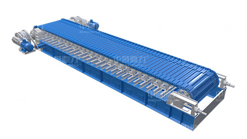 電動機轉動,通過傳動軸和驅動裝置,帶動主軸旋轉,鏈輪和鏈條安裝在主軸裝置上,通過該裝置帶動鏈條上的鏈板做直線運動,鏈條上安裝有承料槽板,鏈板的直線運動將物料均勻的帶到鏈條的槽板上,并向前輸送,達到輸送物料的目的。