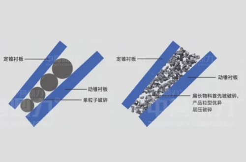 通過采用粒間層壓原理設(shè)計,利用物料間相互擠壓,扁長物料先被破碎,可以提高破碎效率和細(xì)料比例,在很大程度上減少針片狀物料,產(chǎn)品粒形好,并且易損件鋼耗;