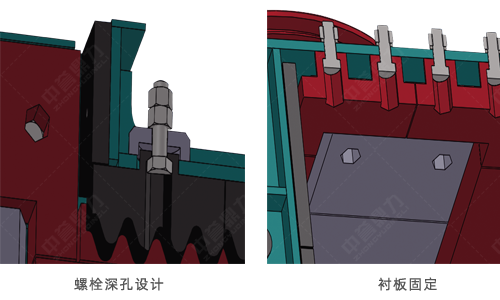 該系列機型采用六角頭高強螺栓固定主襯板、側(cè)襯板,螺栓頭部沉孔為深孔型設(shè)計,防止由于破碎原材料小而磨損螺栓頭部