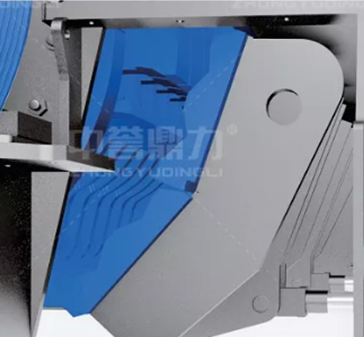 上面一個(gè)反擊區(qū)的反擊板花紋是波浪下行式,它的反擊軌跡是轉(zhuǎn)子的兩路錘頭之間,好處是錘頭對(duì)物料起破碎作用,該反擊區(qū)起到對(duì)物料進(jìn)行整形,從而通過反擊軌跡到兩路錘頭之間加大了破碎率,反擊區(qū)是反擊板的花紋我們采用菱形反擊,他的運(yùn)動(dòng)軌跡是錘頭的下方,加快了物料下行的速度,縮短了物料在機(jī)腔內(nèi)的停留時(shí)間,同時(shí)也對(duì)物料進(jìn)行了反擊整形,第三反擊區(qū)我們采用倒三角反擊,自流,可調(diào)間距的反擊結(jié)構(gòu)