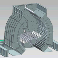 機(jī)殼采用雙腔對(duì)稱設(shè)計(jì),可一次性容納更多物料,提高破碎產(chǎn)量,工作時(shí),電機(jī)帶動(dòng)錘頭高速運(yùn)轉(zhuǎn),對(duì)從上方落入的物料形成沖擊力,此時(shí)的物料獲得動(dòng)能后高速撞向機(jī)腔內(nèi)壁的反擊板,造成物料的次破碎,從物料進(jìn)入機(jī)腔便相互碰撞形成自粉碎,物料在多次撞擊、研磨作用下達(dá)到所需粒度,從機(jī)腔側(cè)下方出料口排出,完成破碎過程。