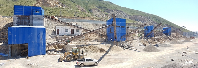 從圖中可以看到,這條時(shí)產(chǎn)600噸環(huán)保石子生產(chǎn)線采用封閉的生產(chǎn)形式,與以前露天生產(chǎn)的情況,整體環(huán)保性有較大的提高,原料倉、生產(chǎn)流程、出料倉均采用密閉板進(jìn)行封閉,從各個(gè)環(huán)節(jié)減少粉塵的產(chǎn)生。