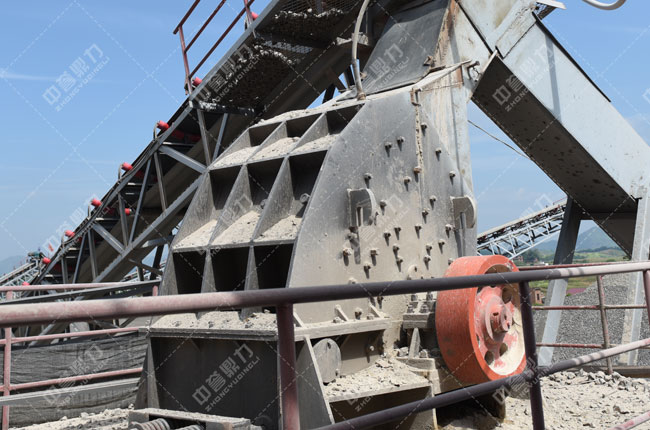 大塊石料經(jīng)料倉均勻、連續(xù)的送到PCZ1512重型錘式反擊破碎機進行粗碎,粗碎后的物料經(jīng)輸帶送到一臺2YKZ2460振動篩進行篩分,篩分出一種20-30成品石子,大于31.5mm的料被一套輸送帶返回進行再次破碎,小于31.5的碎石被輸送到一臺2YKZ2460進行篩分,篩分出10-30、5-10和石粉三種成品料。