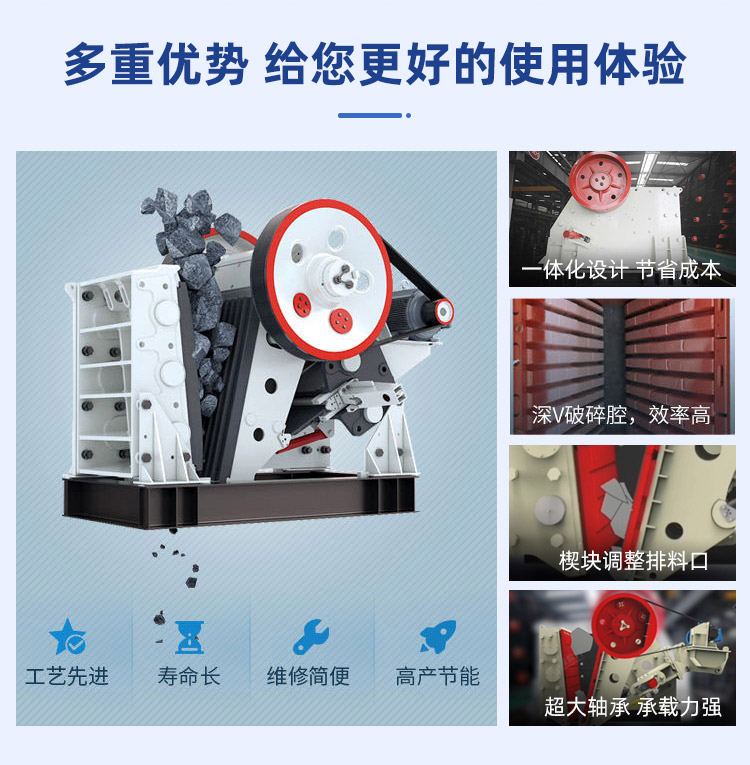 CGE-350顎式破碎機(jī)可處理進(jìn)料粒度750mm以內(nèi)的各種礦石,進(jìn)料口大小為860×1065mm,采用楔塊調(diào)整排料口范圍大小,可在200-270mm之間調(diào)整,適用不同生產(chǎn)需求,生產(chǎn)能力為240-500t/h,電機(jī)功率132kw,重量28.6噸左右。