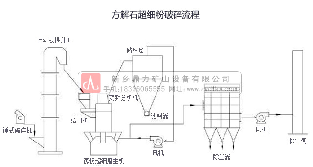 根據(jù)客戶對(duì)于方解石的產(chǎn)品質(zhì)量要求,配置對(duì)應(yīng)的生產(chǎn)線,如果是單單需要比較大顆粒的方解石成品料的話,只需要經(jīng)過(guò)我們公司破碎機(jī)設(shè)備的簡(jiǎn)單破碎過(guò)程,就可以將成品料輸送出來(lái),但是對(duì)于要求比較細(xì)的話,只配置上破碎機(jī)設(shè)備,不能達(dá)到終的要求,對(duì)于細(xì)度需要達(dá)到多少目的話,須配置上的磨粉機(jī)設(shè)備,一般來(lái)說(shuō)生產(chǎn)的大致流程是這樣的,先經(jīng)過(guò)錘式破碎機(jī)的破碎流程,然后使用上斗式提升機(jī)將成品料提升到儲(chǔ)料倉(cāng)內(nèi),然后經(jīng)過(guò)振動(dòng)給料機(jī)的輸送,輸送到細(xì)磨設(shè)備內(nèi),便完成了生產(chǎn)的過(guò)程,要的時(shí)候,需要配置上旋風(fēng)集粉器和脈沖除塵設(shè)備,大致的生產(chǎn)過(guò)程如下圖: